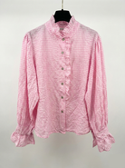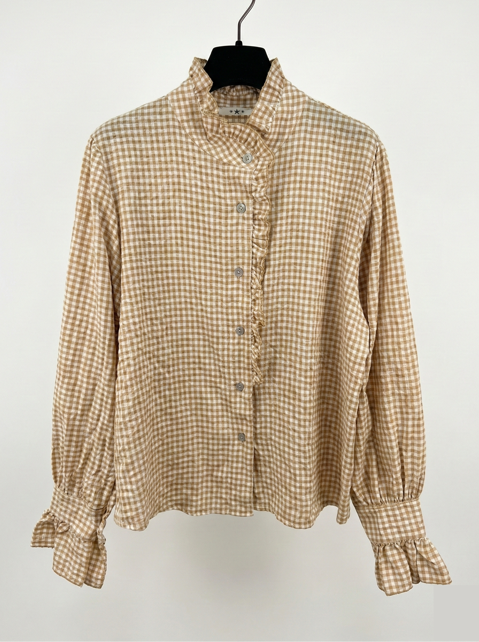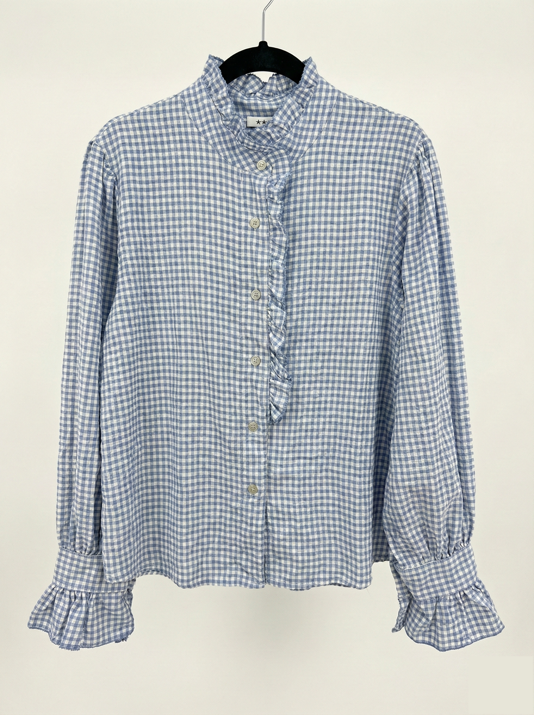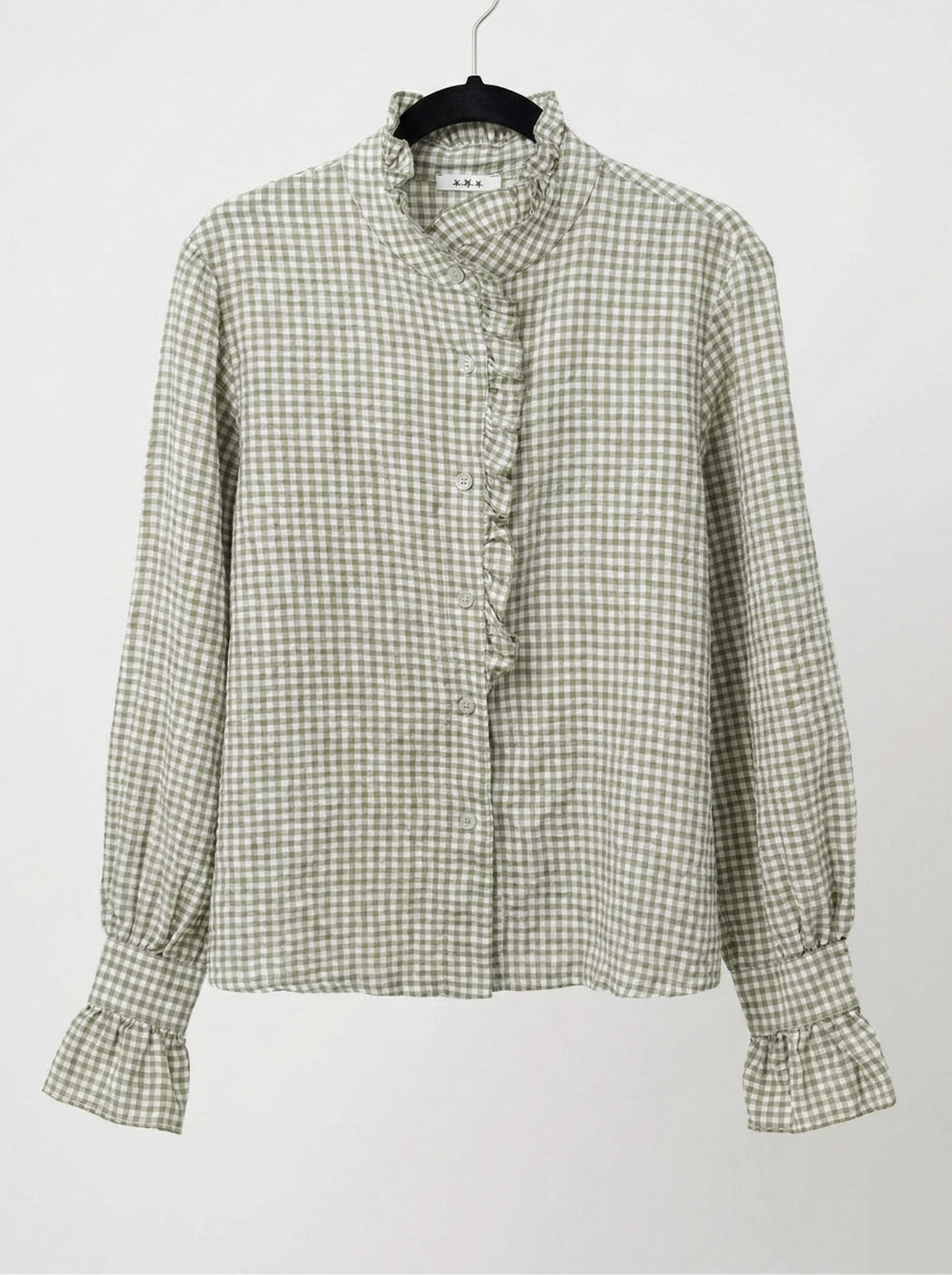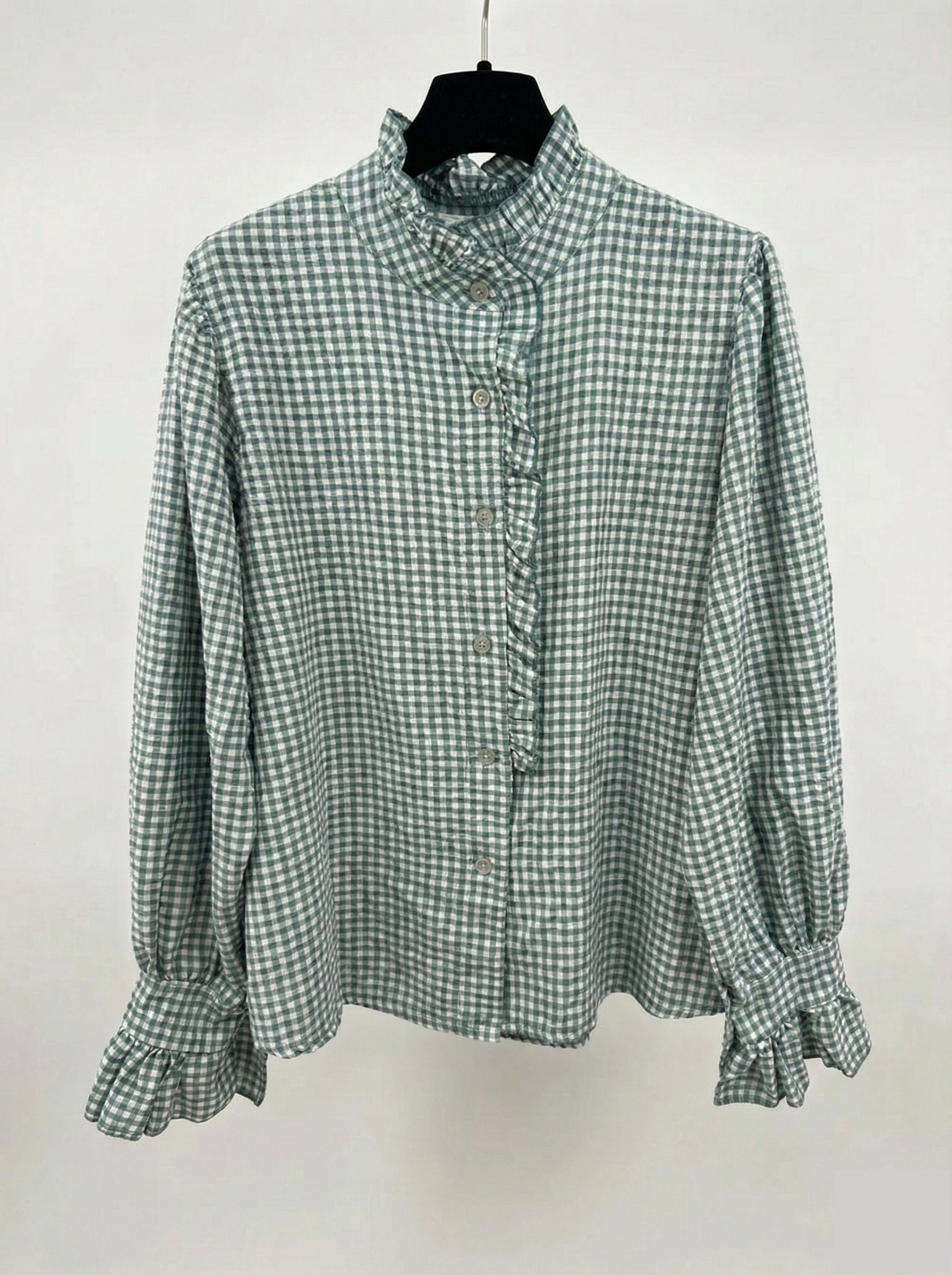 Embrace timeless femininity with this charming gingham check shirt. Crafted from a breathable blend of 65% cotton and 35% polyester, it delivers comfort without compromise. The striking stand-up collar with ruffled trim, central button placket adorned with delicate frills and long sleeves finished with ruffled cuffs create an effortlessly romantic aesthetic. The straight cut flatters sizes 36-42 (UK 8-14), making it a versatile essential for elevating your everyday style with vintage inspired elegance.