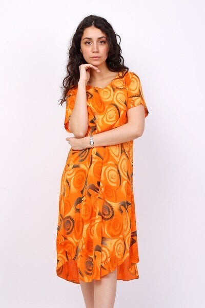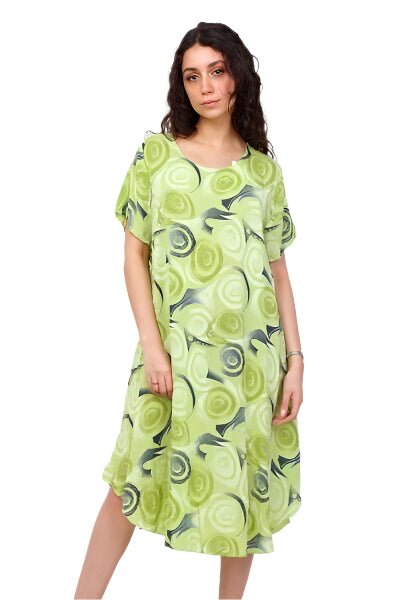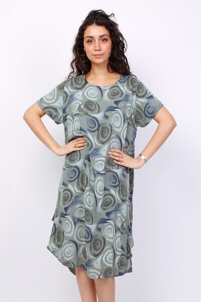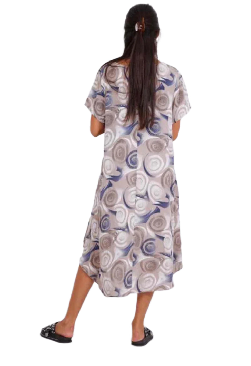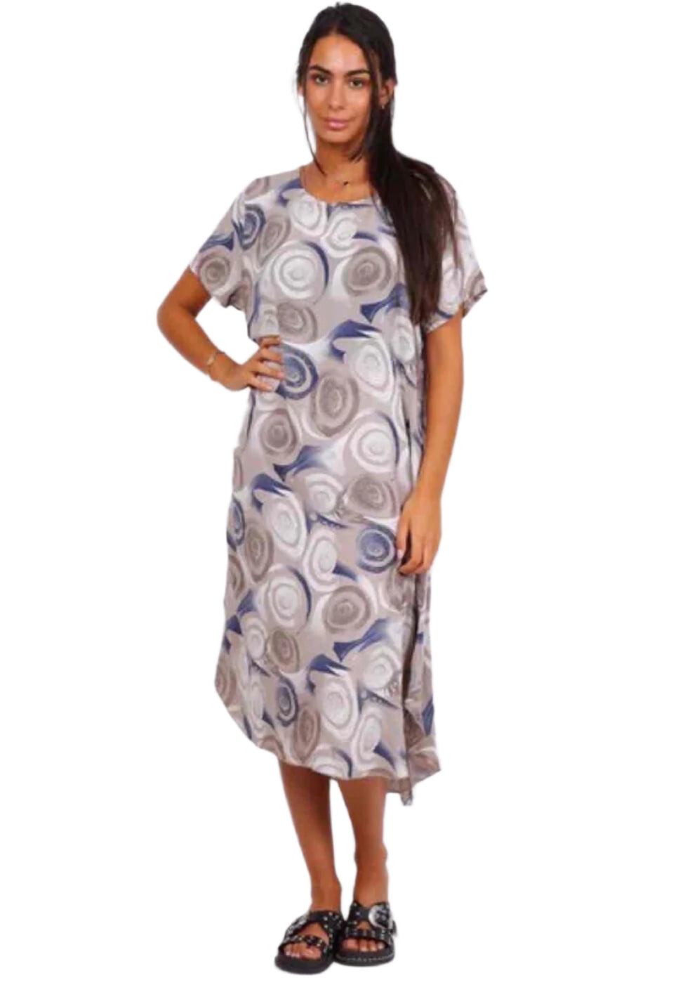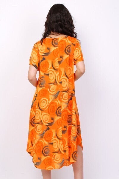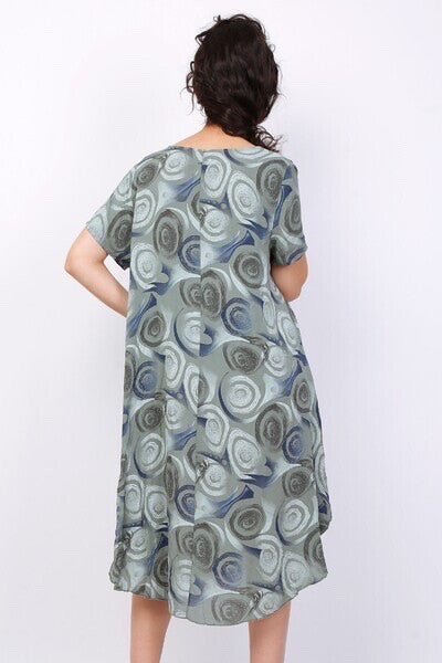 This stylish printed dress features a flattering shaped hemline, round neck and short sleeves for a chic, effortless look. Crafted from a comfortable blend of 95% cotton and 5% elastane, it offers both breathability and a slight stretch. Made in Italy, this one-size design fits sizes 38 to 48 (UK 10-20), combining elegance and versatility for any occasion. Made in Italy.