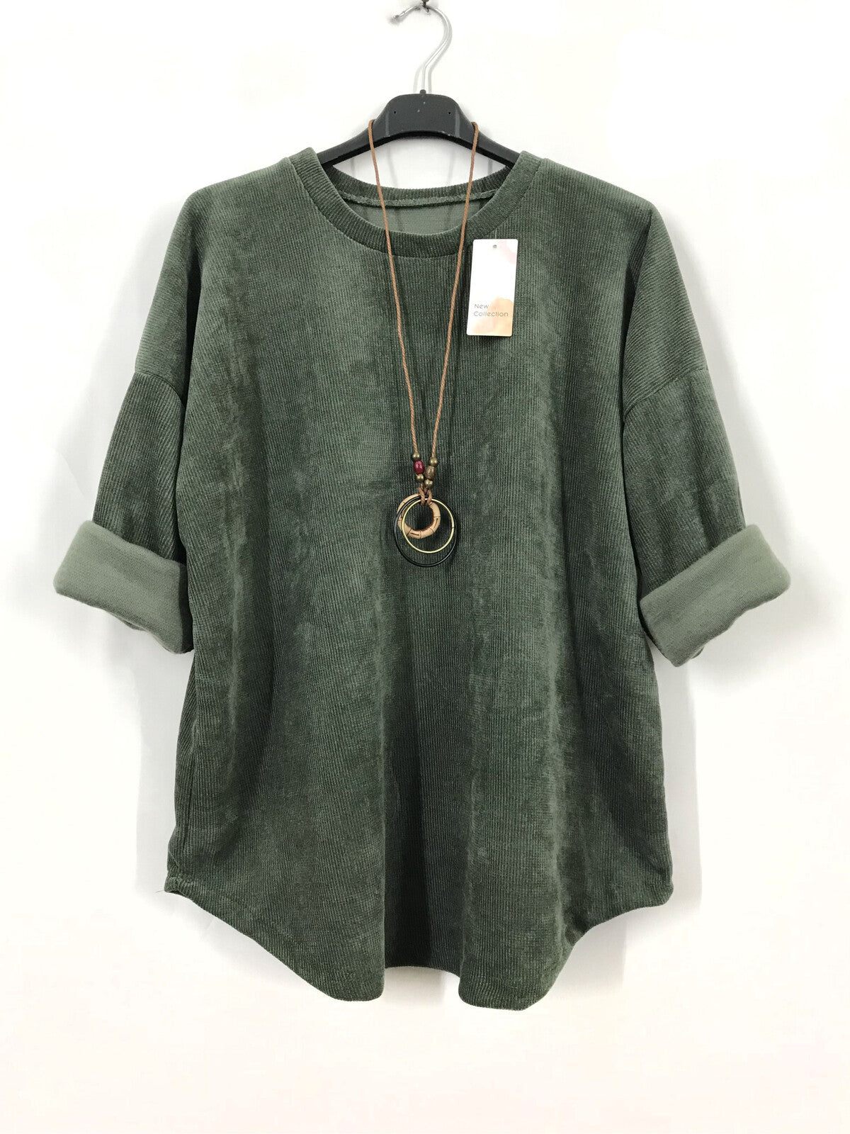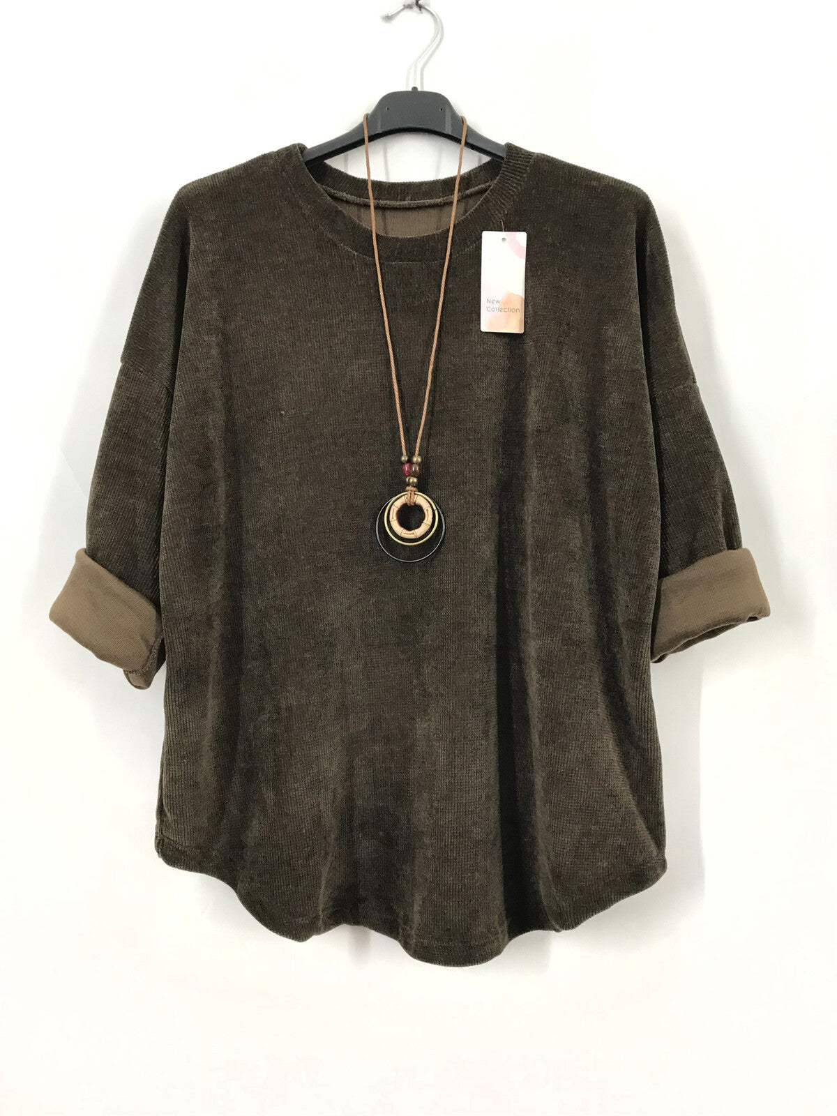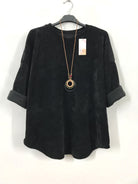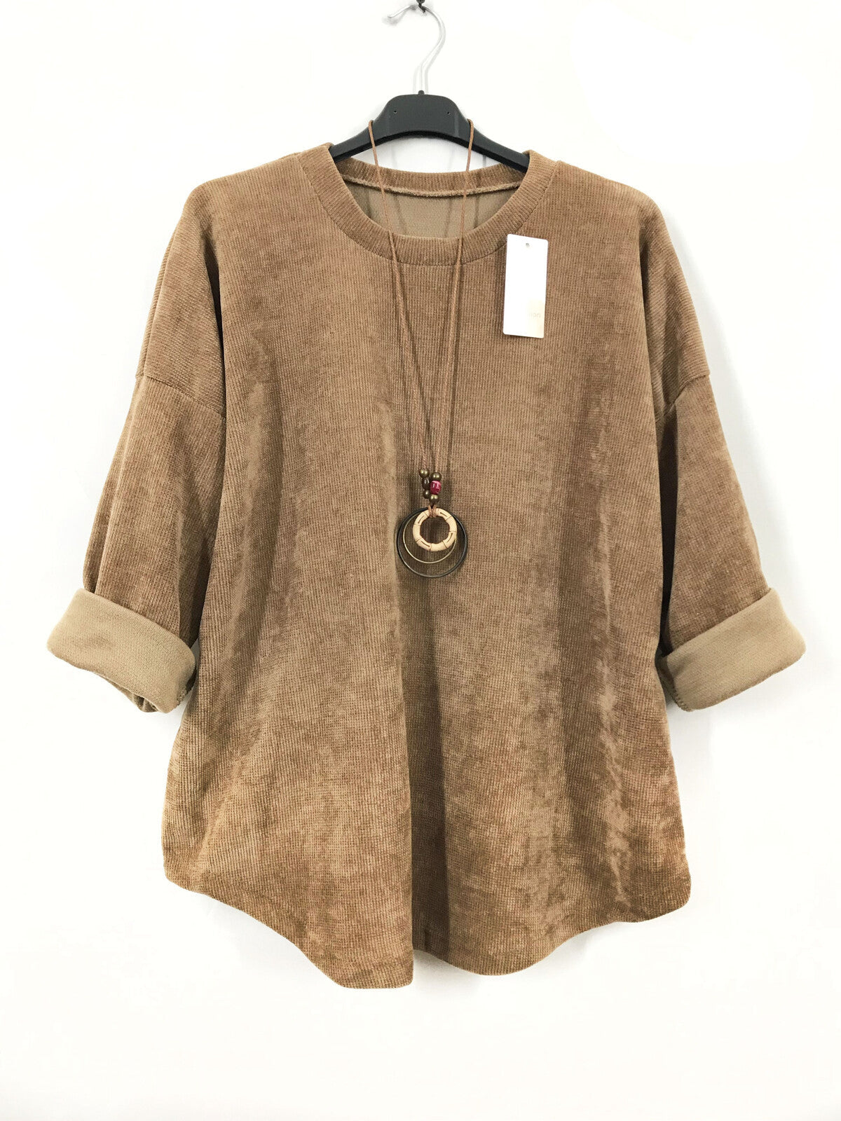 This velour top features a soft, stretchy velvety fabric that ensures comfort and elegance. Designed with a round neckline and long sleeves, it comes in a versatile solid color. The included necklace adds a charming finishing touch to your look. With a generous bust circumference of 130cm and length of 72cm, it comfortably fits sizes 40 to 48 (UK 12-18). Crafted from a blend of acrylic, viscose and polyester, this top combines style and durability effortlessly.