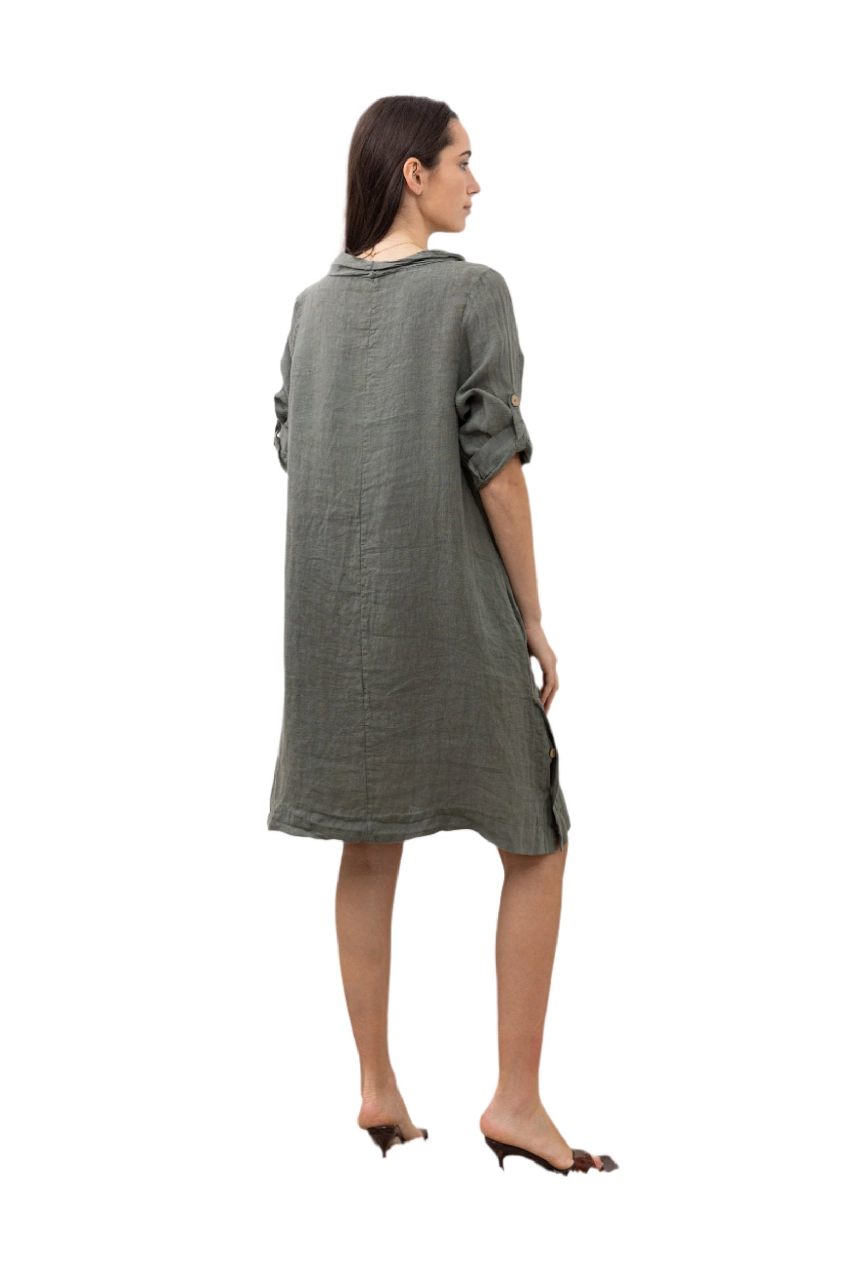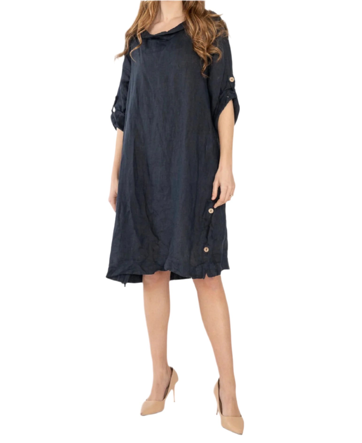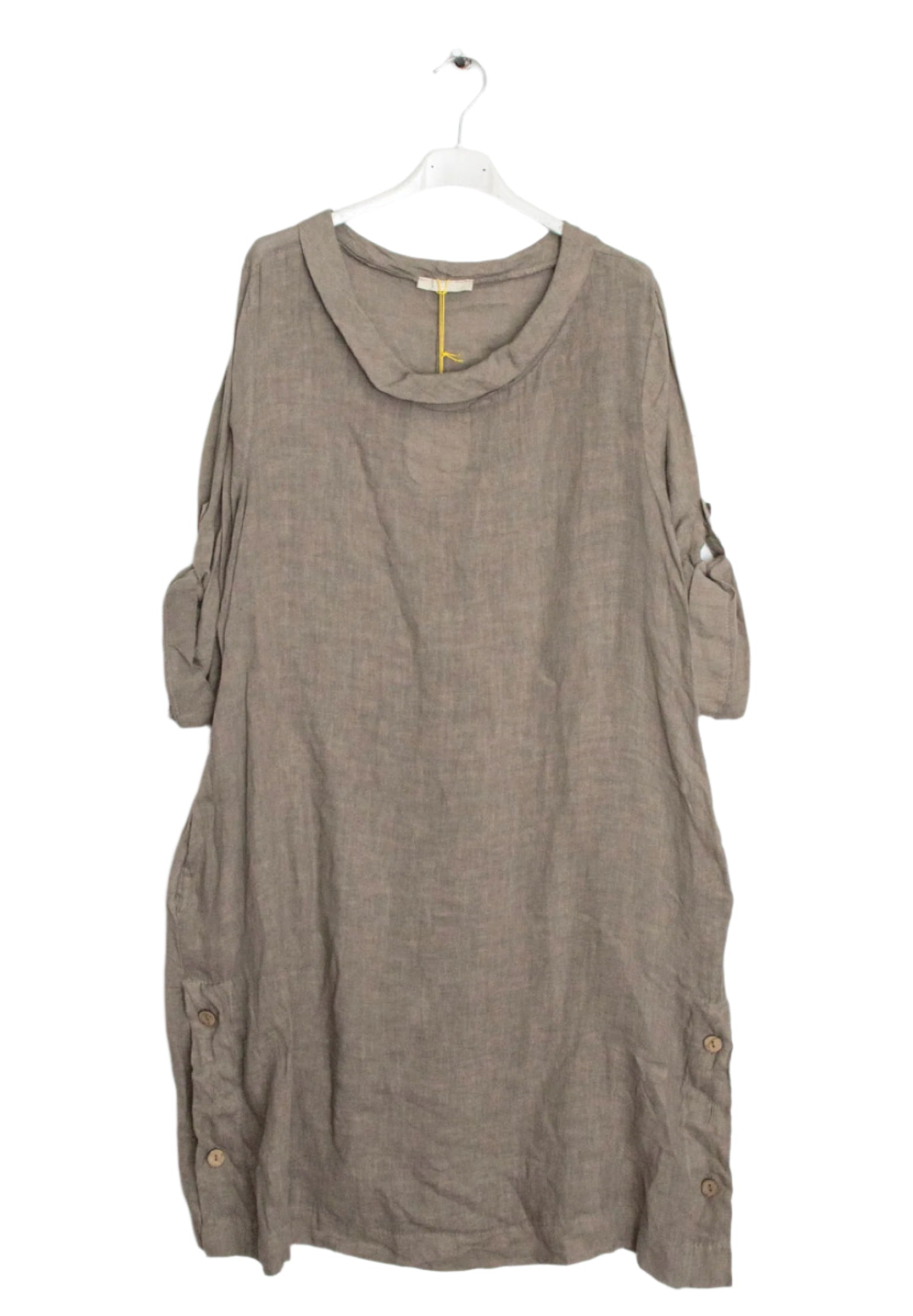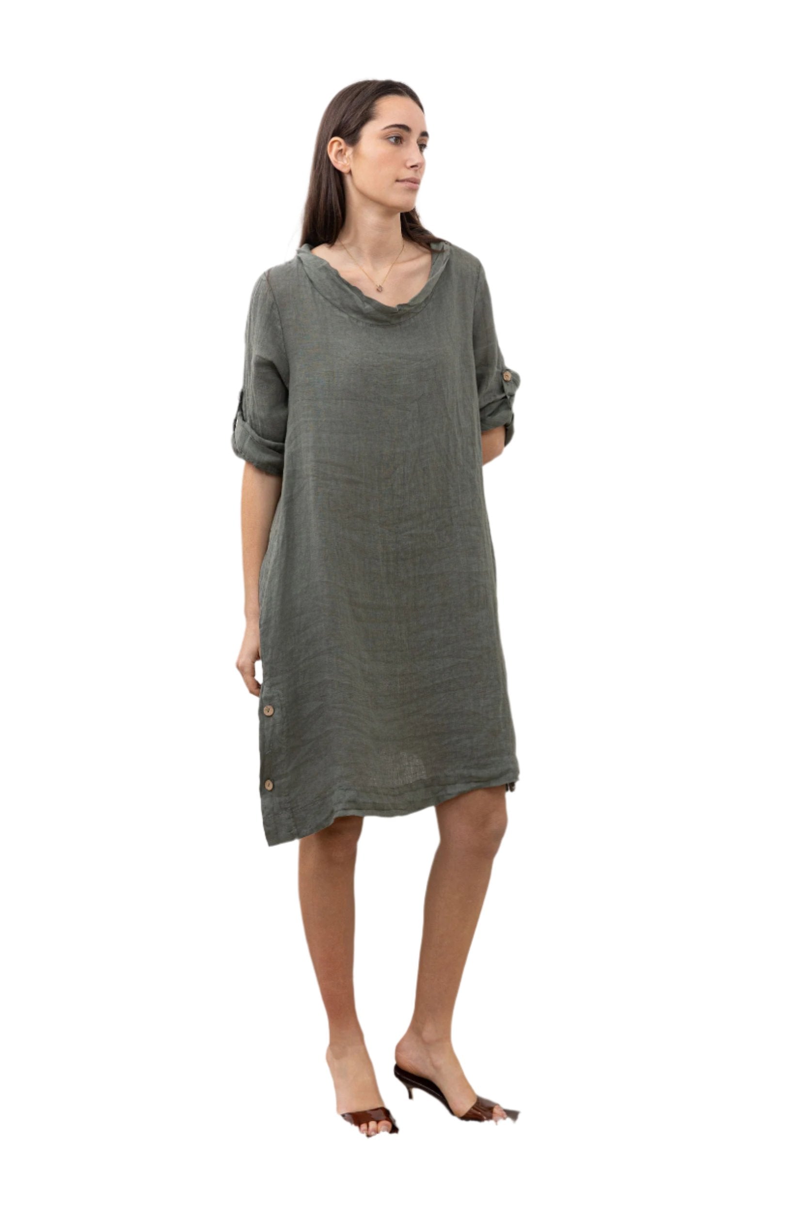 Inspire by effortless sophistication with our Italian Chic Midi Linen Cowl Neck Shift Dress. Made in Italy, this one size dress features a round cowl neck, side button detailing and stylish three quarter sleeves with button fastening. Crafted from 100% linen for both style and practicality, indulge in effortless style.