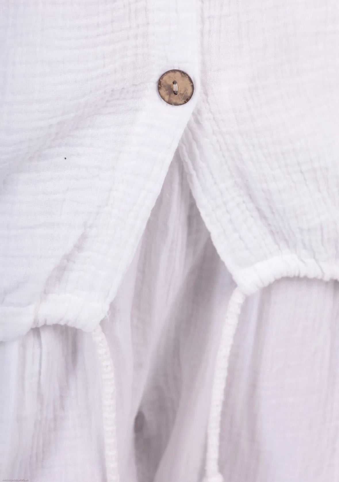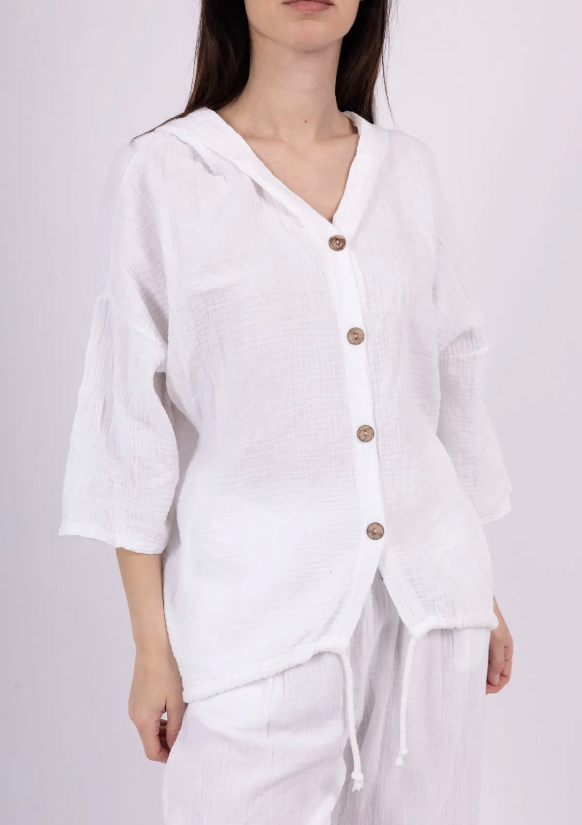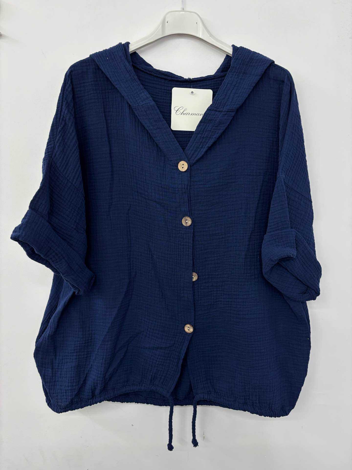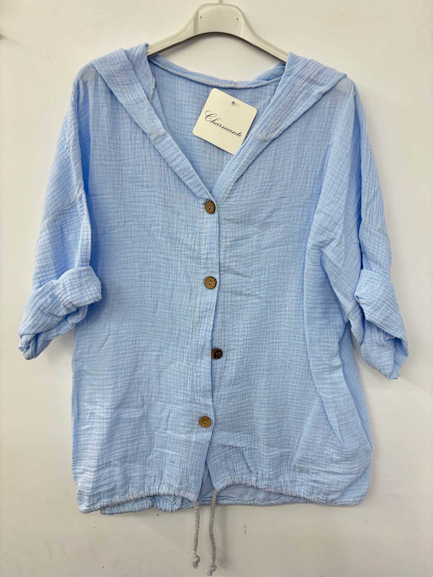 Lightweight 100% cotton jacket with hood and buttoned fastening, designed for warm seasons. One size to fit 40–44 (UK 12-16). Breathable natural fabric ideal for seasonal transitions. Versatile piece to wear alone or layered.