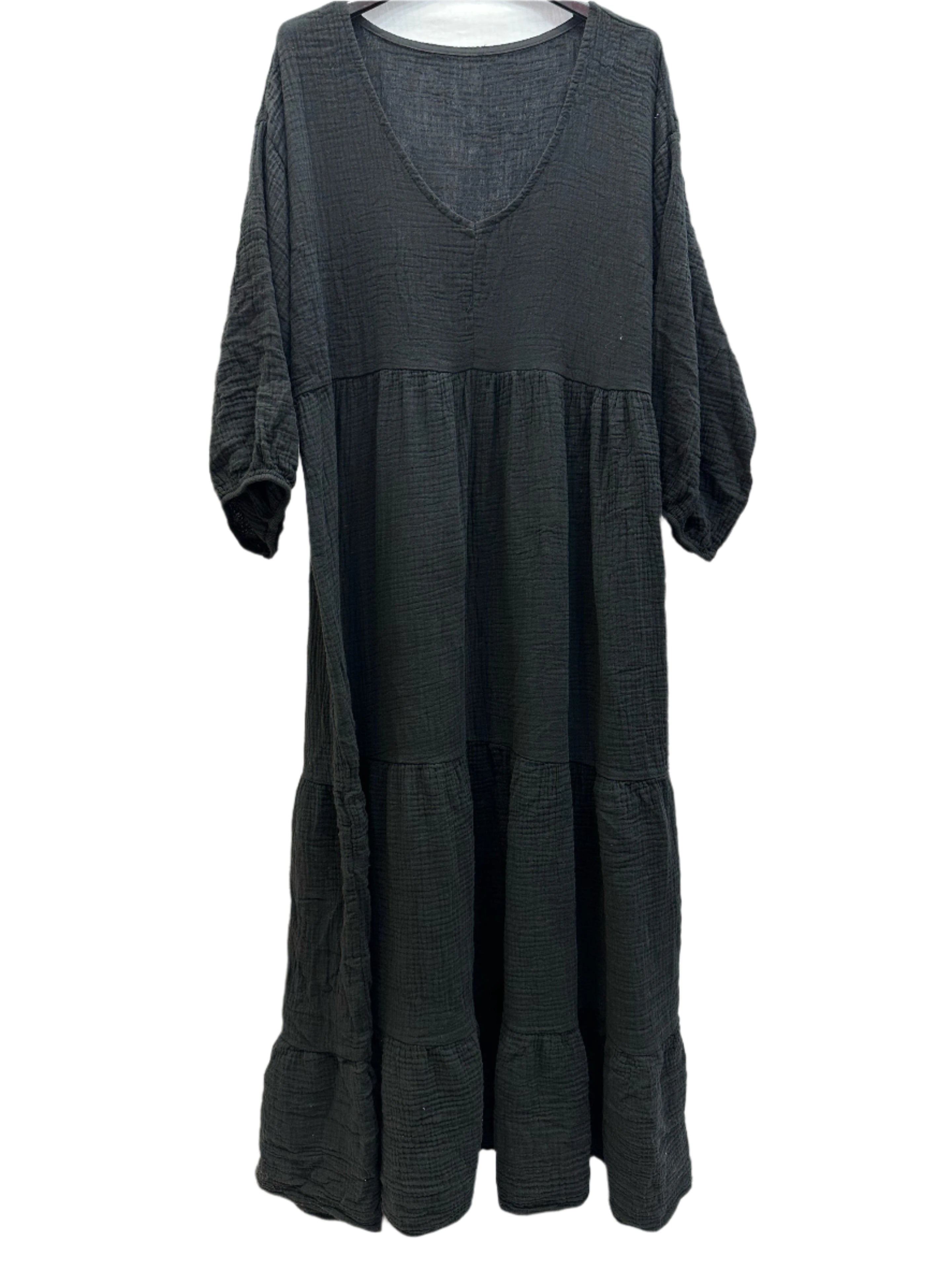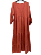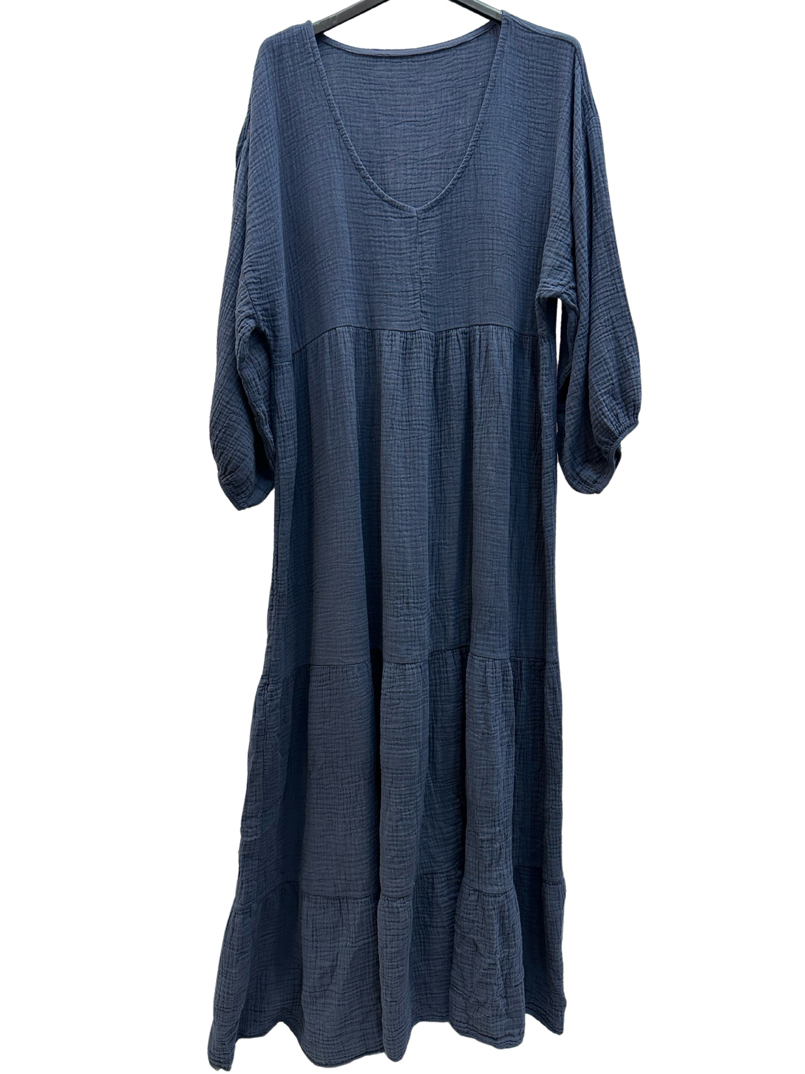 Indulge in comfort and style with our One Size Cotton Gauze V Neck Long Sleeved Tiered Maxi Dress. Made in Italy with 100% cotton gauze, this dress features a flattering V neck and elasticated cuffs for maximum comfort. Available in a range of colours, perfect for every stylish woman. One size 40 - 44 (UK 12 - 16).