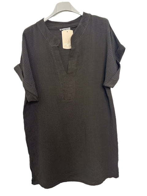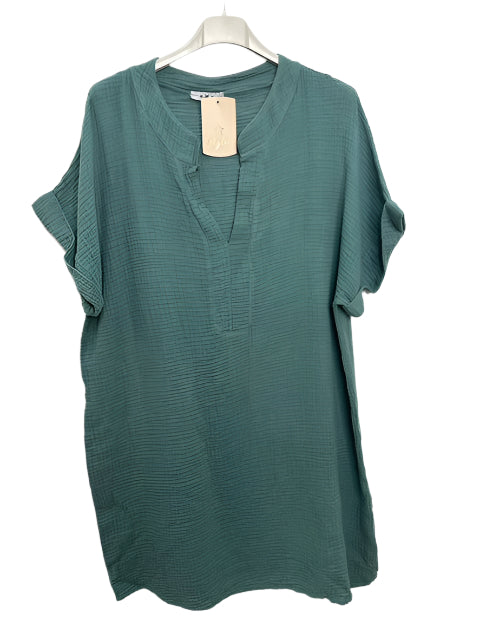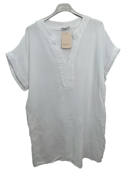 Indulge in Italian craftsmanship with this versatile short cotton gauze tunic dress. The v-neck and mao collar create a flattering silhouette, while the breathable 100% cotton fabric ensures all-day comfort. At 93cm long, this one-size wonder fits sizes 38-44 (UK 10-16), making it the perfect addition to your summer wardrobe. Authentically made in Italy.