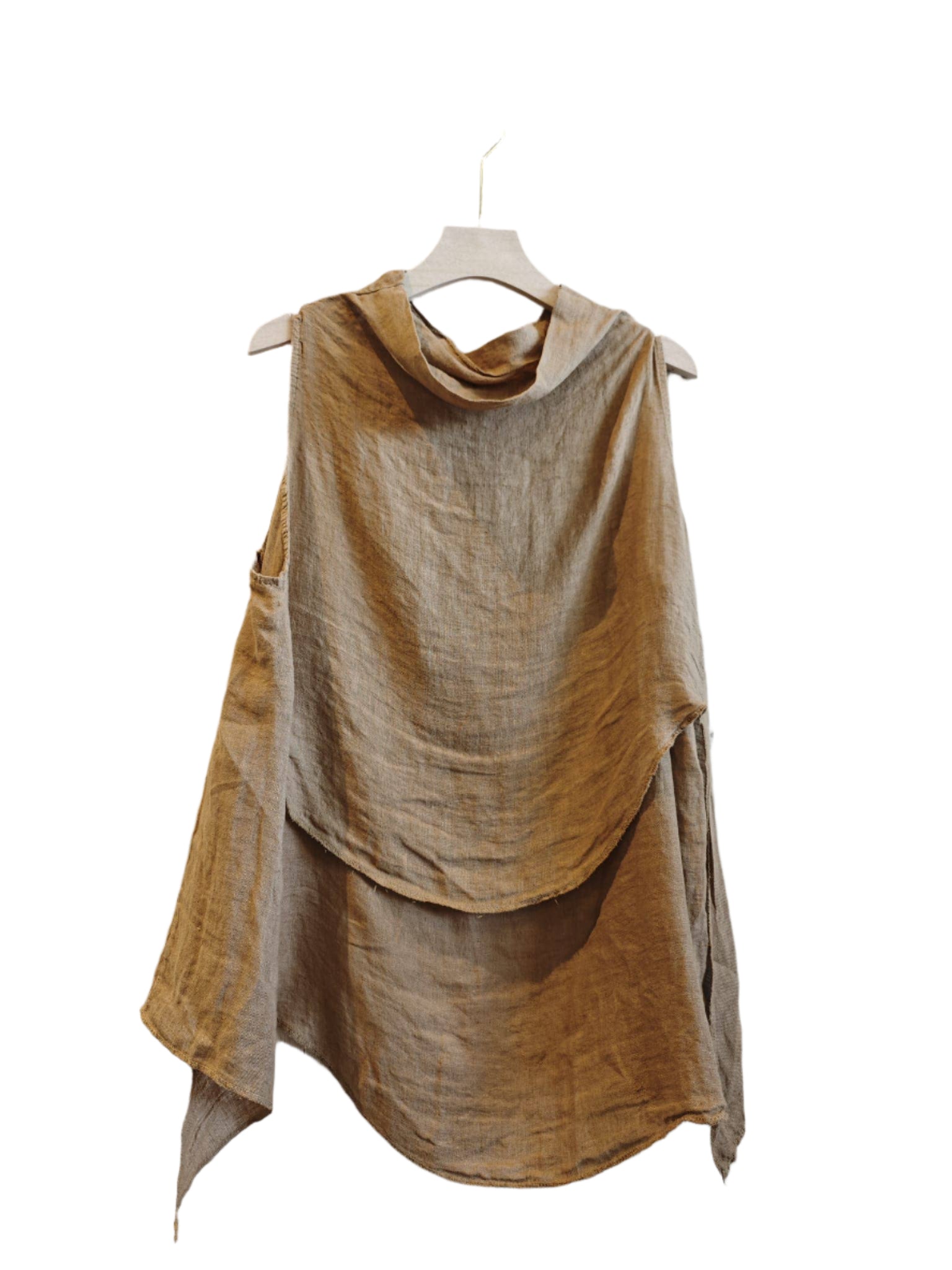 This sleeveless high neck blouse, crafted from 100% linen, offers breathable comfort and a chic, timeless look. Its unique design features a front length of approximately 46 cm and a longer back length of 66 cm, creating an elegant silhouette that flatters any figure. Perfect for warm days or layering, this one size top combines style and ease effortlessly. 38 - 46 (UK 10 - 18)